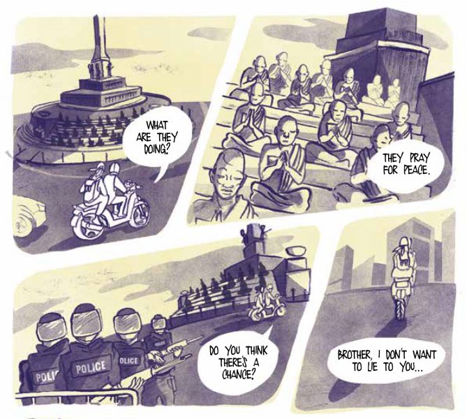 I think what a graphic novel allows is multiple levels of interpretation and analysis. It’s kind of built into the format. In terms of messages, I think thematically there are layers. You know, a lot of our readers in Thailand are middle class and this is not necessarily a story they are familiar with. This is not the story of politics that they experience. So the first step and the first message is to show that different parts of society were going through a political transformation—a change in the way they understand their relationship with the state, with the country. One thing we did was show the way news comes into contact with the people. In the beginning they come to a radio and they kind of distractedly listen to it, then TV where they pay attention, and then they become part of the national news.